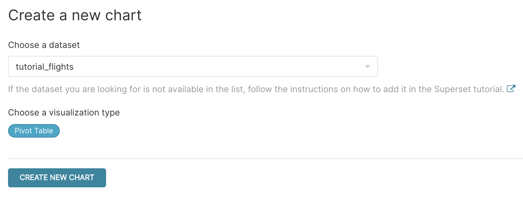 Create a new chart by selecting + ‣ Chart from the top right corner. Choose tutorial_flights again as a datasource, then click on the visualization type to get to the visualization menu. Select the Pivot Table visualization (you can filter by entering text in the search box) and then Create New Chart.